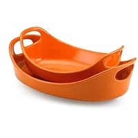 In vitrified, high-fired stoneware, the glazed bakers are nonporous to prevent residual stains or odors and strong for chip and crack resistance. The versatility of stoneware renders the bakers safe for use in the microwave, freezer, dishwasher, and oven, sustaining temperatures up to 500 degrees F. To transfer hot dishes from the oven to the table, wide oval handle holes are provided on both bakers' two 4-inch high ends. Between the ends, the baker's height gradually descends to 2 inches at the center of its oval body. The shallow sides at the baker's center enable crispier crusts and even browning. For neat storage, the small baker fits inside of the medium baker. The bakers shouldn't be subjected to extreme temperature changes as that may cause permanent damage to the stoneware construction. Likewise, avoid freezing liquids in the bakers as they expand upon freezing. Made in China, the baker set is covered by a limited lifetime warranty. The baker set is available in several vivid colors, including blue, green, yellow, and orange. The small baker measures 11-1/2 by 7 by 4-1/2 inches and the medium baker measures 14 by 9-3/4 by 4-1/2. Together, they weigh 7 pounds upon shipping.