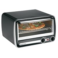 Whether it's breakfast, lunch, or an afternoon snack, this 1500-watt toaster oven serves as a versatile multi-function family oven. The large-capacity unit can accommodate a full 12-inch pizza or six slices of bread, while under-the-door control knobs offer toast-darkness control and adjustable temperature with the ability to broil/top-brown food. A 30-minute timer with automatic shutoff provides added convenience and peace of mind. The appliance sports a beautiful, black-enamel metal exterior with chrome accents for a clean modern look that is sure to complement any kitchen decor. The toaster oven's unique space-saving, low-profile design fits easily under kitchen cabinets, and its nonstick interior and convenient slide-out crumb tray make cleanup a snap. Two removable oven racks are included. The unit measures 17 by 16-3/4 by 11-1/4 inches and carries a one-year warranty.